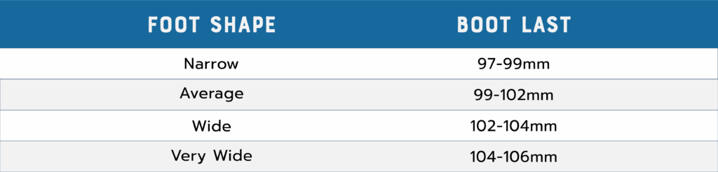 Measured in millimeters, “last” refers to the width of the boot at its widest point, which is generally across the forefoot. A narrow last is generally around 97-99mm, an average last is from 99mm-101mm, and a wide last being wider than 102mm. Gear nerd note: The “raw” measurements here are derived from the last of a 26.5 ski boot. The smaller the boot, the last will be proportionally smaller. So a “100mm” last boot in a 24.5 will actually be 98mm. All that to say, it’s not as easy as measuring your forefoot to determine what last you should be in.